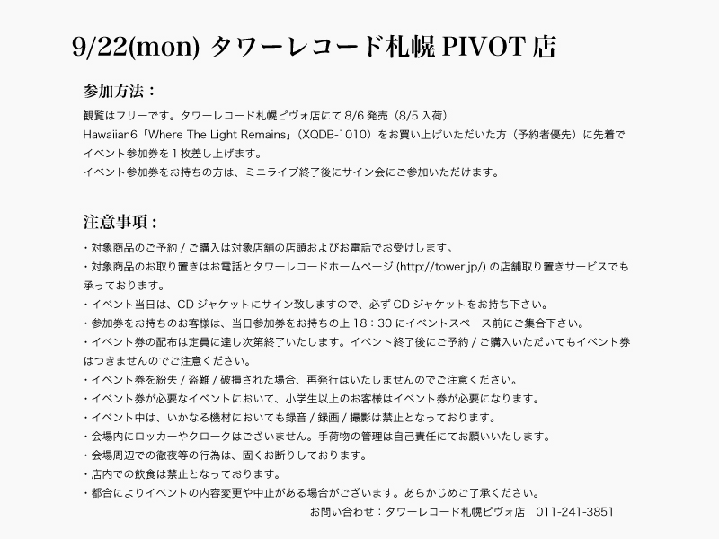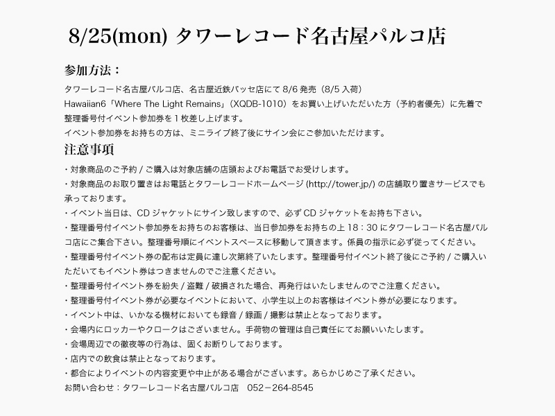 HAWAIIAN6 よりお知らせです。